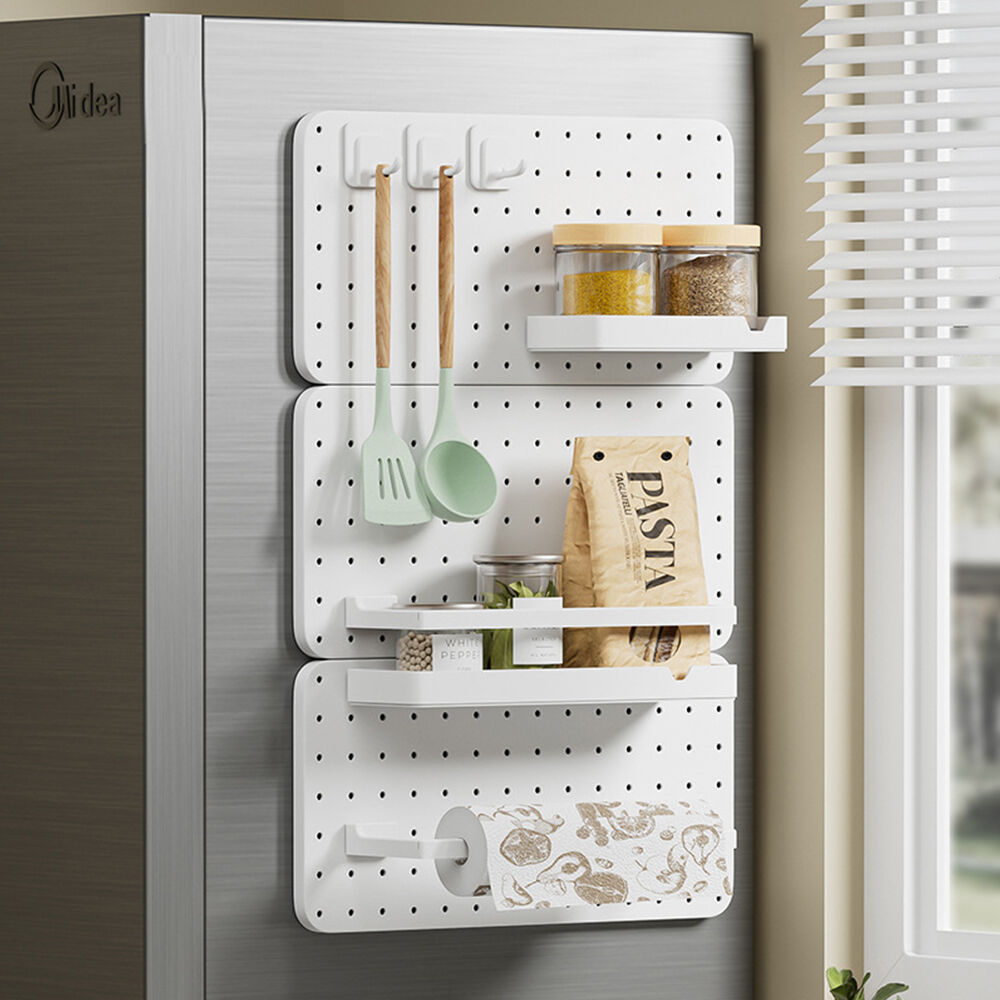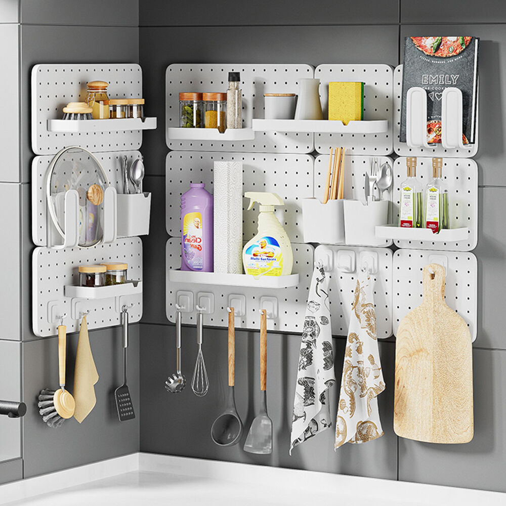 An efficient storage solution for modern kitchens lies in this space-saving, flexible, and stylish modular pegboard storage system. Crafted from high-impact polystyrene (HIPS), it comes with versatile accessories including hooks, a shelf, an uncovered plastic storage box, and plastic pegs. You can freely combine and fix various items such as kitchenware, seasonings, and cleaning supplies as needed. The wall-mounted design fully releases countertop space, transforming cluttered and crowded kitchens into neat and organized spaces with smoother operational workflows.