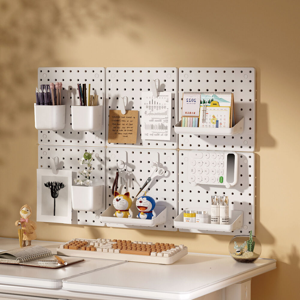 Modular Free Combination: The standard configuration includes a pegboard, shelf, uncovered storage box, 4 hooks, and 40 pegs. Accessories can be flexibly combined and fixed, and multiple sets can be spliced and expanded to meet different storage needs.