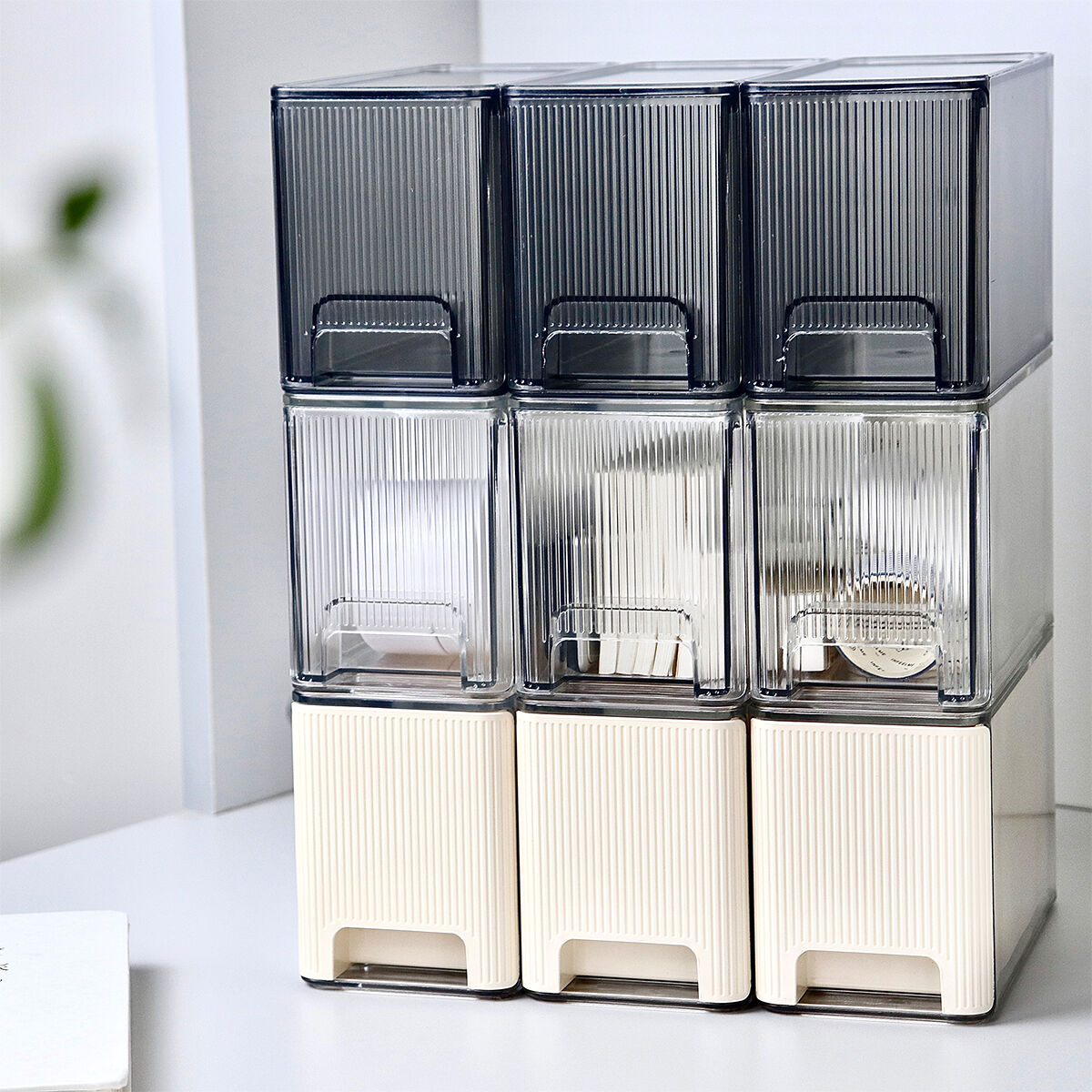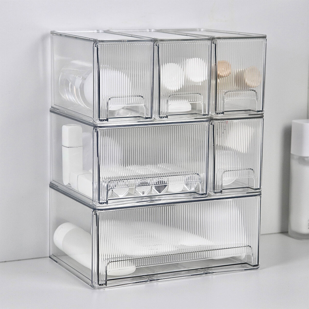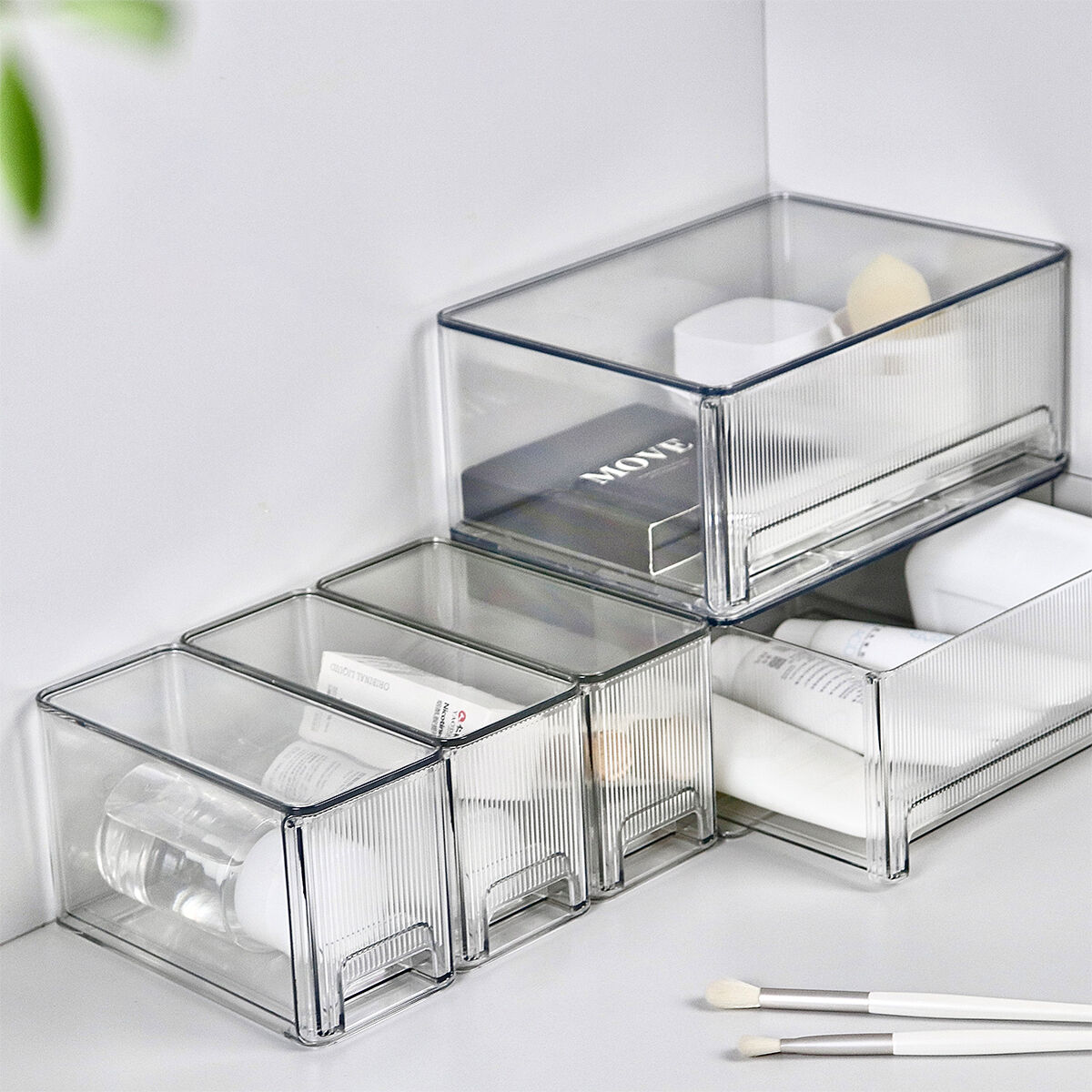 - Bathroom vanity: Utilize the waterproof and moisture-proof properties of PET to store beauty samples, cotton pads, hair ties, cleansing tools, etc. Modular stacking fully utilizes the vertical space of the countertop, avoiding clutter in humid environments.