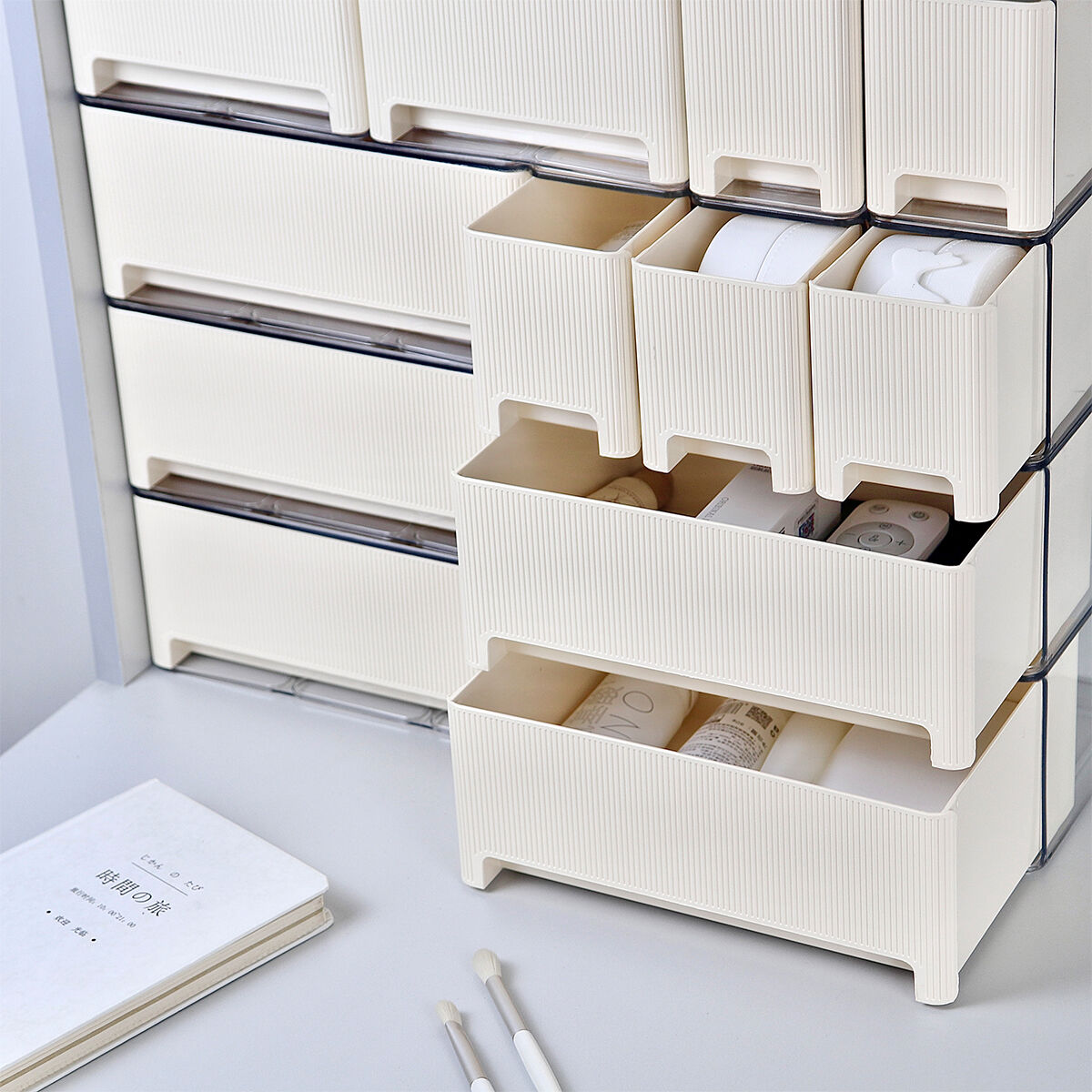 - Bedroom dressing table: Classify and store lipsticks, eyeshadows, makeup brushes, skin care products, beauty samples, jewelry, etc. The high-clarity drawers allow you to find items at a glance, and the modular combination adapts to dressing tables of all sizes. Bid farewell to cluttered beauty products and make your makeup routine more smooth.