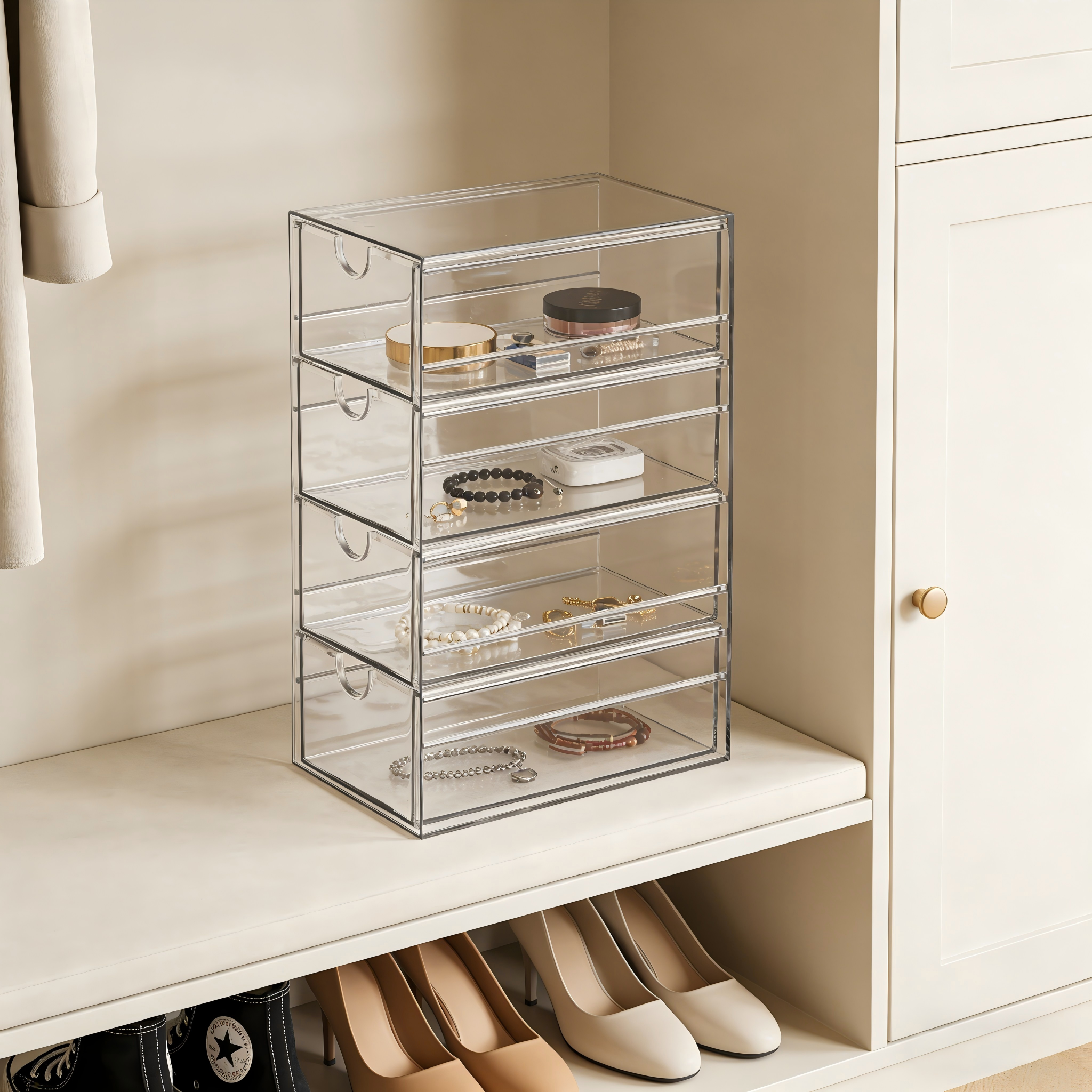 Suitable for vanities, dressing tables and bathroom cabinets to store lipsticks, eyeshadows, makeup brushes, beauty blenders, skin care products, cotton pads, jewelry and other small beauty items, with clear classification at a glance.
