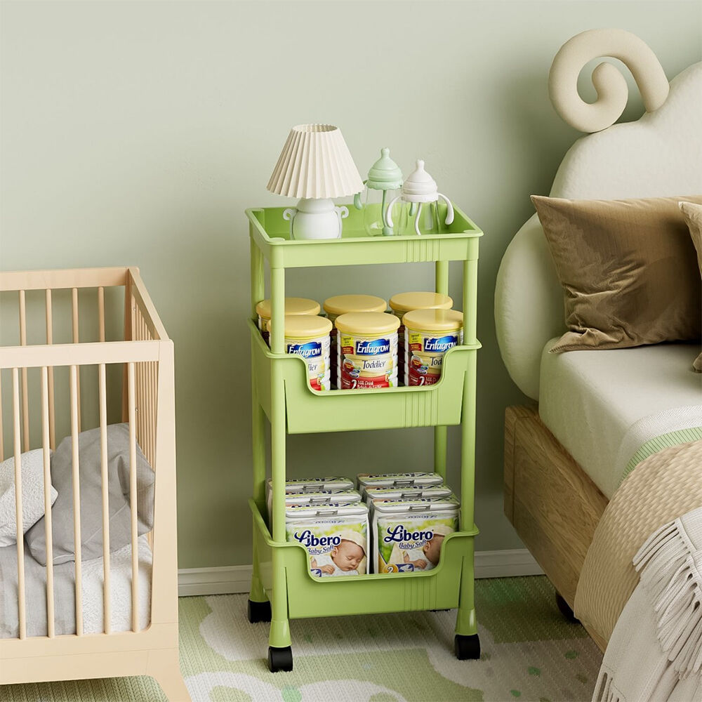 Living Room Storage Scenario: Positioned in living room corners, beside sofas, or next to TV cabinets, it stores picture books, toys, snacks, remote controls, etc. Its fresh colors match home decor, and the wheels enable flexible movement—pushed to the side while binge-watching or quickly organized when guests arrive, keeping the living room tidy.