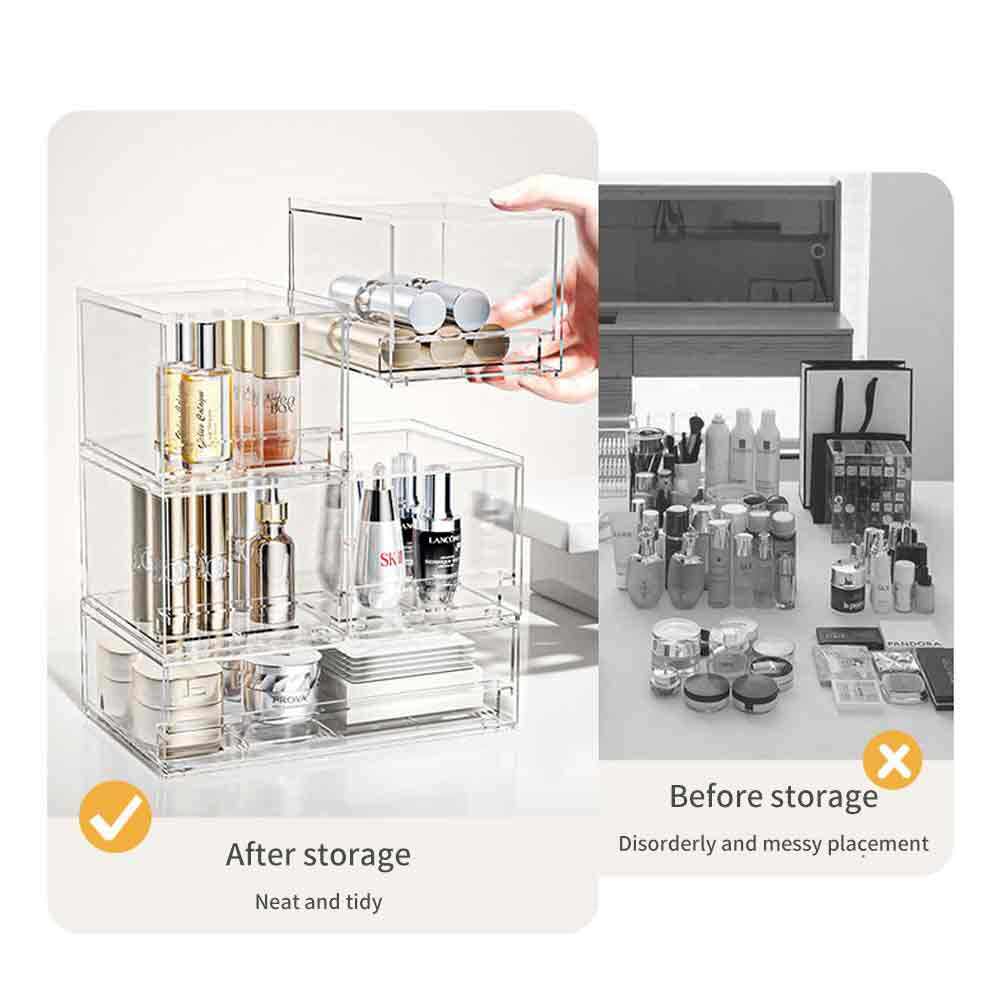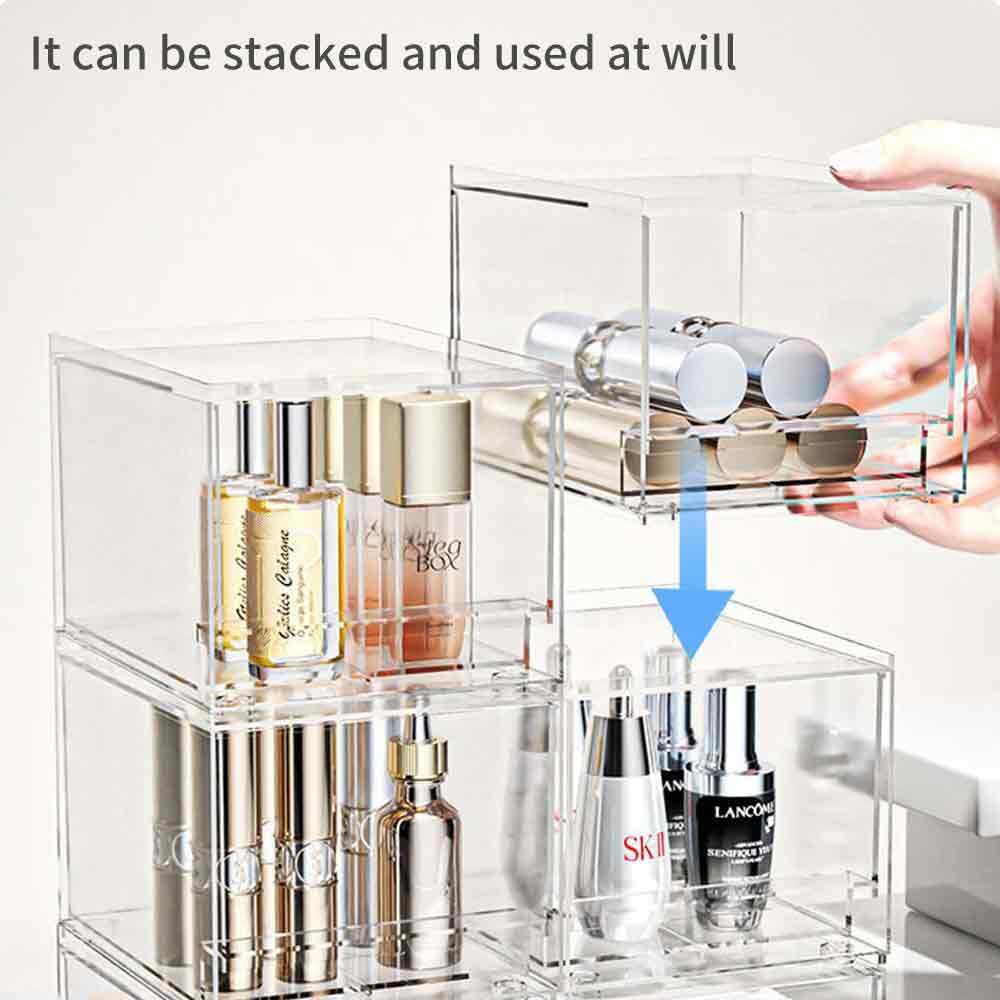 With a modular drawer-style design, it stores beauty products in separate zones, integrating cosmetics, skincare items and makeup brushes in multi-layer drawers. It is freely stackable without tipping over, with smooth drawer slides without jamming. Equipped with non-slip pads at the bottom to protect countertops, it comes in multiple capacities to store lipsticks, eyeshadows, essences, facial masks, makeup brushes and all kinds of beauty products. It keeps items neatly organized to save vanity space, and the fully transparent design allows for quick item search and access. No assembly is required – ready to use right out of the box, balancing beauty organization, storage tidiness and ease of use.