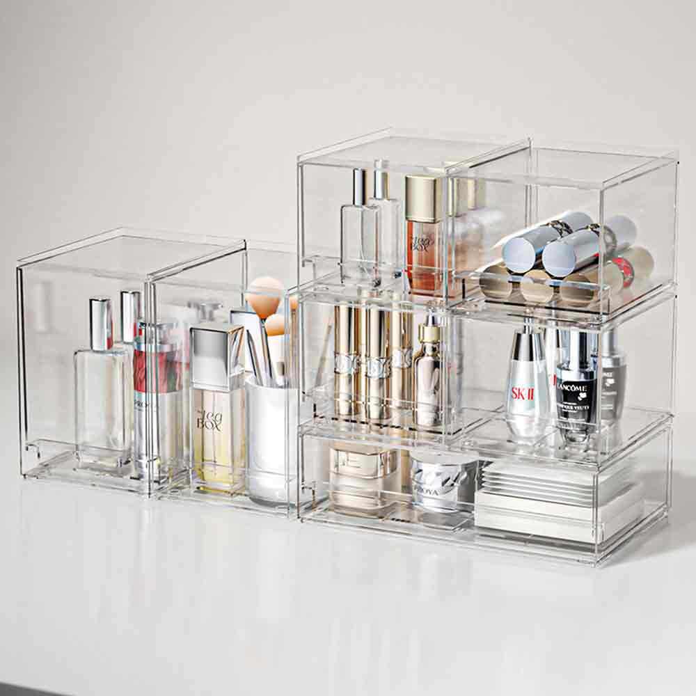 As the primary usage scenario, it fits all kinds of household vanities. The drawer-style compartmentalized design stores lipsticks, eyeshadows, foundations, essences and other beauty items, while the transparent high-clarity design makes beauty products visible at a glance. Freely stackable to fully utilize vertical countertop space, it eliminates clutter and creates a tidy makeup environment.